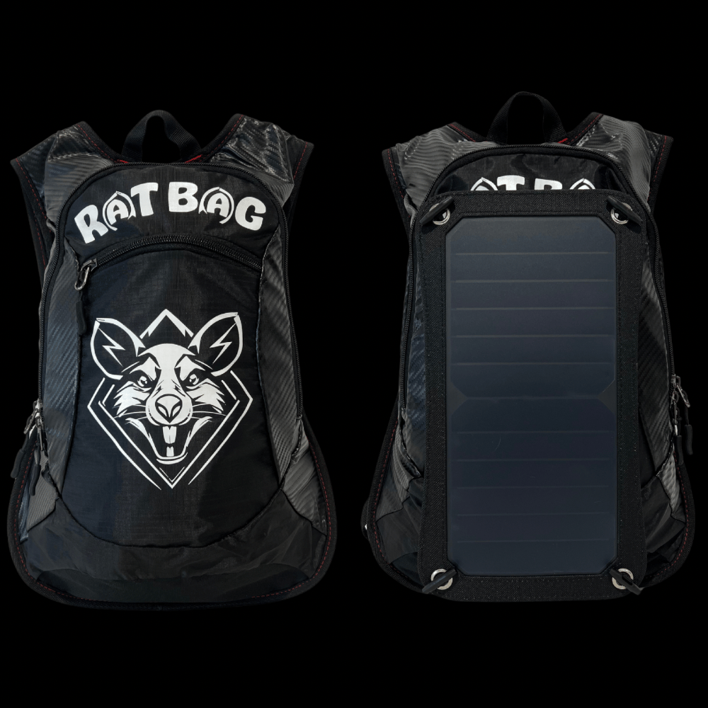 • Our Premium RAT BAG version comes with a 10W solar panel that simply connects straight to the bag. It also includes a 10000mAh power bank to charge all your devices on the go, so you never have to worry about running out of battery on your devices again.